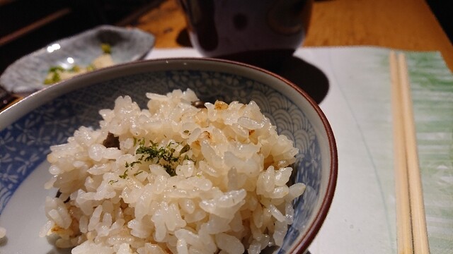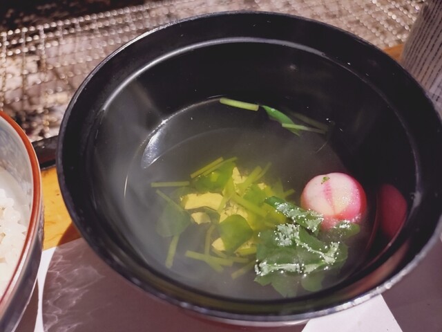 最後の和牛も堪能しました。魚介や野菜をさっぱりといただいた後は、和牛のパンチのきいたお味がうれしいです。わさびに岩塩を練り込んだものをつけていただきます。脂が甘いです。付け合わせのオニオンスライスをぽん酢にさっと付けて、口の中がさっぱりします。