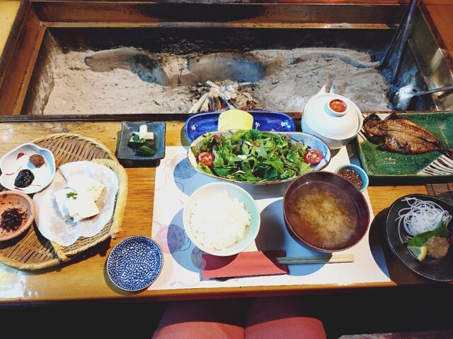 食事は炭焼き。ご主人が丁寧に焼いてくださいます。前菜やお椀など、地の物をたくさん使ったお料理で、とてもおいしいです。