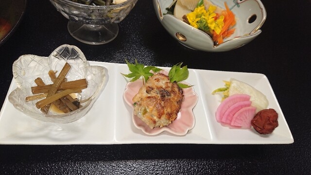 心尽くしの夕飯。お料理を見て、まずは「きれいだなー」。それぞれの食材を生かして、とてもきれいに盛り付けられています。ウキウキしてきます。