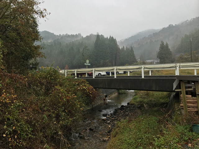 店は山が開けた所に忽然と現れます。道路から入って行くとお店の前に軽自動車用の駐車場が3台くらいで、橋を渡った池の所に広い駐車場があります。駐車場は未舗装で枠はロープです。