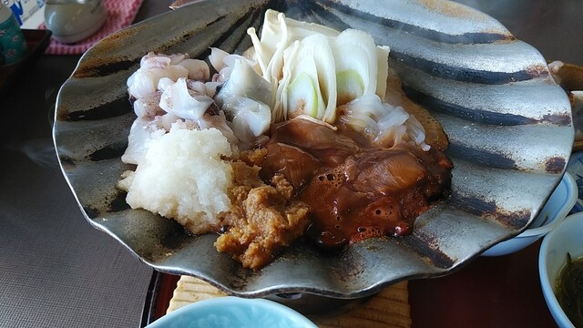 ホタテ貝の形の鍋に、イカげそ・イカワタ・大根おろし・ねぎ・味噌を混ぜて焼く。
