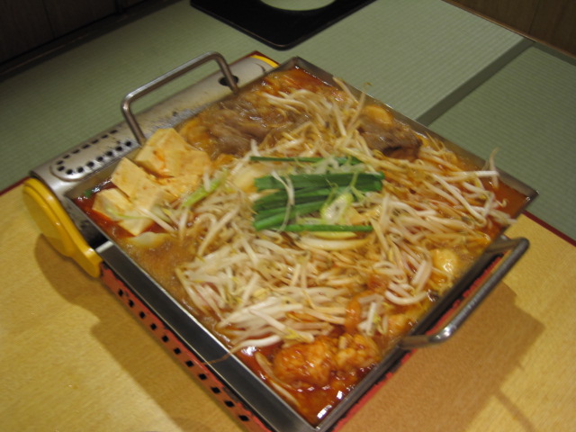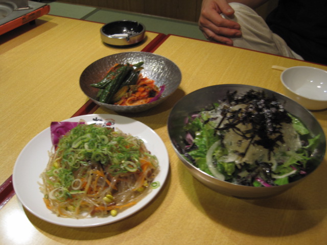 お料理は、チョレギサラダ、チャプチェ、トッポギ、チジミ、キムチと、唐揚げ、肉鍋。(だったかしら^^;)