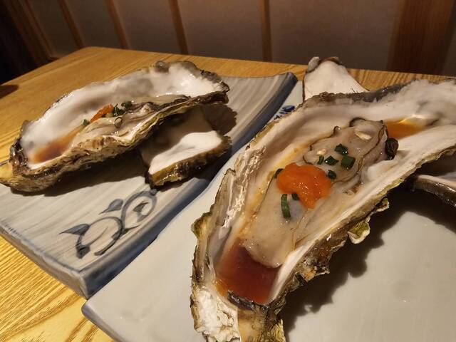 全席個室という贅沢さがまず魅力で、ゆっくり落ち着いた時間を過ごせるお店です。この日は気になる料理をいくつか注文してみました。最初にいただいた生牡蠣はとても大ぶりで、ぷりっとした食感と濃厚な旨みがあり、ひと足早く冬の味覚を味わえたような満足感。続いて串盛りを注文しましたが、色々食べたい私にはぴったりの内容で、【ネギマ.皮.はつ.つくね.砂肝】