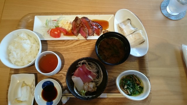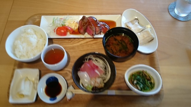 若狭牛ステーキをメインに、鮮魚の盛り合わせ、魚料理、小鉢、ご飯、味噌汁、食後のコーヒーが付いています。