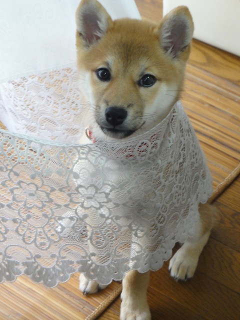 凛!どこから顔を出してんの!と良く見れば、レースのカーテンにいつの間にか縫い目にほつれがあったみたいで、ポッカリと穴が開いてるところに、凛が首を突っ込んでこっちを見てるじゃないですか!