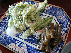 お茶の天ぷらとフキの炒め煮