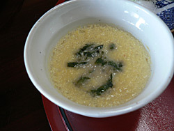 よもぎの風味が漂う茶碗蒸しの少し硬めのような料理です。
