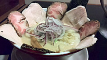 タマネギのスライスと2種類のチャーシューが花火煮のように交互に置かれています