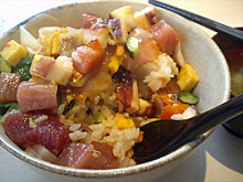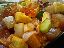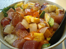 イクラ、サーモン、マグロ、タコ、イカ、玉子、キュウリ、タイなど特製の醤油ダレがかけられキラキラしていました。
