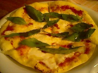 モッツァレラチーズとトマトソースにスゥイートバジルのみで焼き上げたシンプルだけどとっても美味しい自家製生地のピッツァです。