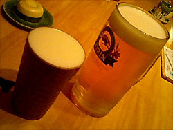 私はアルコールは嗜む程度に…と注意を受けていますので陶器製のタンブラーでいただきましたが、同僚たちは飲みごたえのある男前ジョッキ(大ジョッキのことのようです。価格は1,000円)で注文しました。
