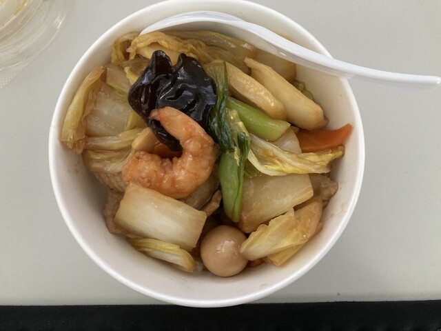 以前はこちらではあんかけ焼きそばをいただいたことがあり、今回は中華丼・税込み918円をチョイス。中華丼を食べるのは何年ぶりだろうと思いながら、食べ進めましたが、エビ、イカ、豚肉、うずらの卵、白菜、ニンジン、タケノコ と具材のバラエティさが嬉しいですね。味付けは少し甘い感じがして、お酢をかけたくなりましたが、総菜のお弁当にありがちの尖ったしょっぱさはなく、オイスターソースの深い味わいも感じられてGOOD!です。具材の中では豚肉が一番おいしかったかなぁ。少し厚みにある豚肉で中華丼の餡に負けない食べ応えが美味しかったです。