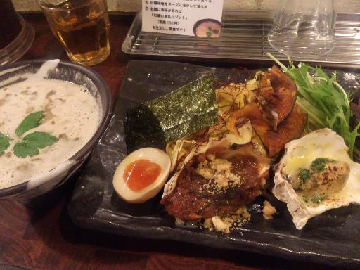 皿には、和えられた麺と数え切れないぐらいの具材(チーズ牡蠣、味噌牡蠣、炙りチャーシュー、
