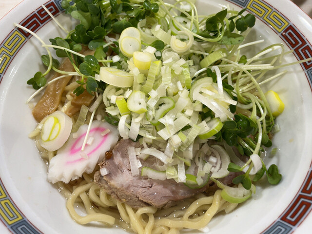 さらに、厚く切られたチャーシュー、なると、メンマのほか、たっぷりのカイワレ、ネギがのる。