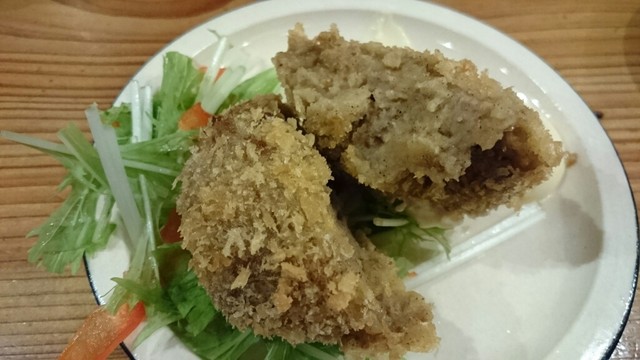 酒は2杯目、東京下町でお馴染みのキンミヤの水割り320円。そう、金宮酒造は四日市の酒蔵なのです。つまみもう一品何か頼もうかなと、めにはいったのがコロッケ120円。具がずいぶんとスパイシー。聞けば黒胡椒をかなり効かせているとのこと。流石です!魚だけではなく、惣菜にもこだわる店。最高です。