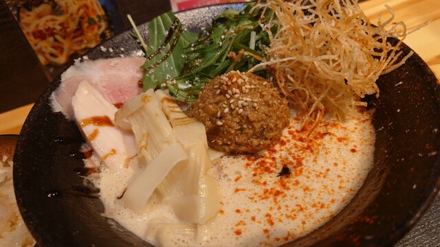 麺は太ちぢれ麺。カンスイ多めと言うよりかはパスタ的なコシをもった麺。トッピングにはそぼろ肉玉、チャーシュー二種。低温調理のホロホロ肉の鶏と豚の食感の良さ、穂先メンマは、、、、これどこで売ってるの?と聞きたくなる新食感のメンマ。