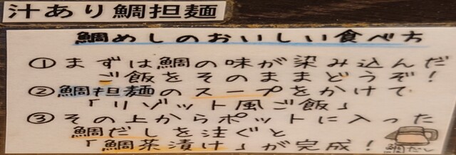 鯛めしはそのまま食べてみるとすごくあっさりとした炊き込みご飯。濃厚なラーメンを食べた舌には物足りなさを感じますが、お店のオススメの食べ方でラーメンのスープを混ぜるとあら?不思議。
