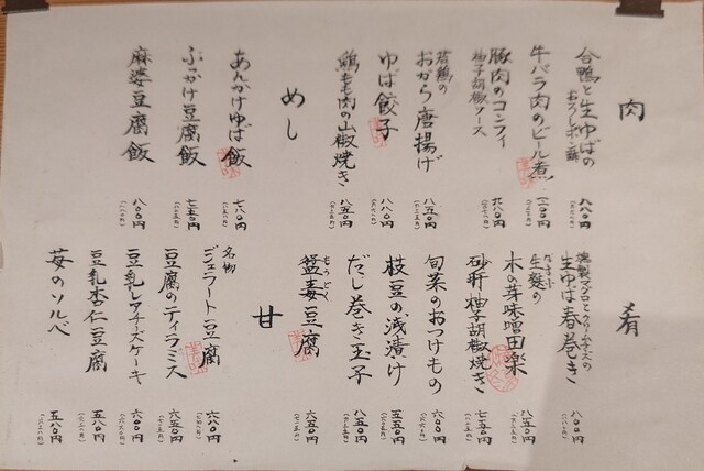 豆腐は濃厚でキメ細やか。美味しい豆腐って塩が本当に合う、、、と思ったらここ豆腐の醤油が抜群に美味い!この豆腐にカスタマイズされたんだろうか?すごくマッチする。