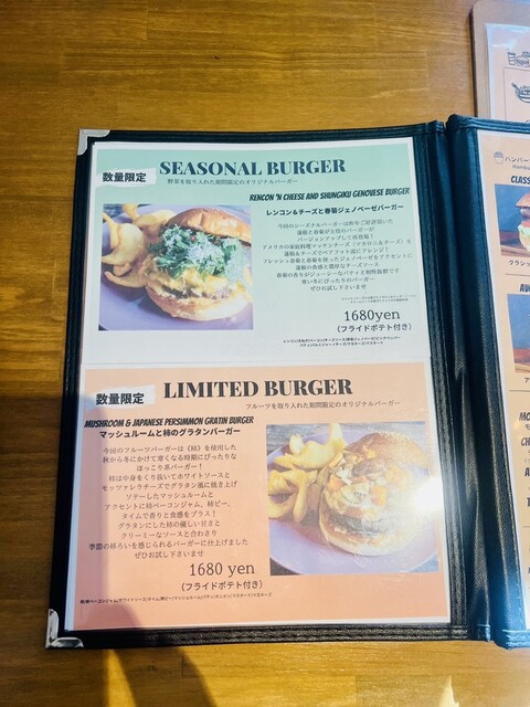 そして限定バーガーがあり、この日は「レンコン&チーズと春菊ジェノベーゼバーガー」とか「マッシュルームと柿のグラタンバーガー」とか名前見てるだけで???というバーガーたちも。もはやハンバーガーをこえていますねー。