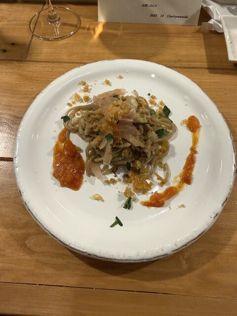 地金目鯛・自家製カラスミ(蕎麦粉のパスタ!)