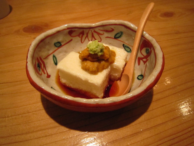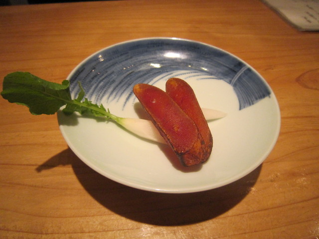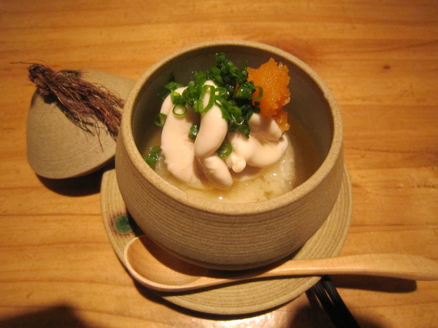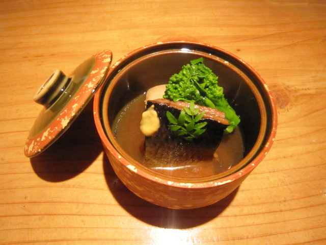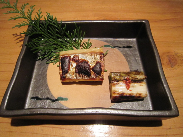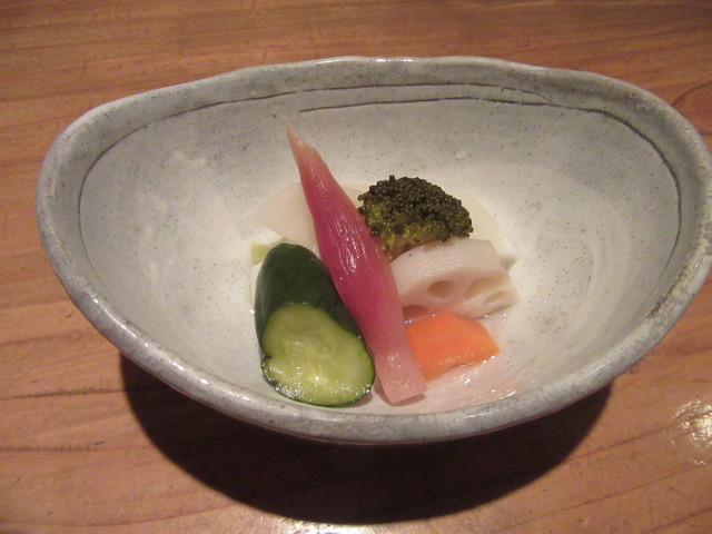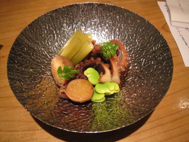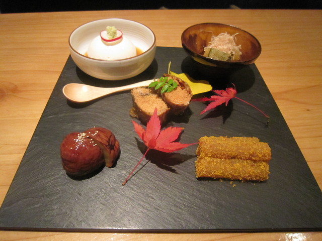 内容は「嶺岡豆腐・子持ち昆布・守口大根の唐墨まぶし・栗渋皮煮・子持ち鮎煮浸し」・・・相変わらず味も盛りつけのセンスも光る