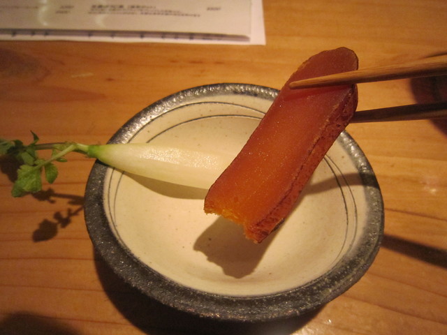 「自家製からすみ」:こちらのスぺシャリテで、少し炙って香ばしさを加えた味は感涙物。