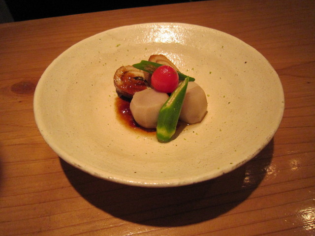 「冷し野菜煮」:冬瓜・石川芋・茄子・青だつ(ハスイモの葉柄)・ヤングコーン・オクラなどで、それぞれに丁寧な技が施され、青柚子の香りも嬉しい。