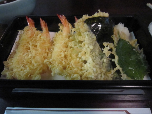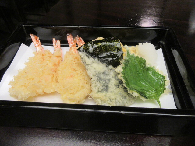 黒塗りの器で供される内容は、「天南ばん」用に小さ目の海老を二連で揚げたものが2つと烏賊のかき揚げ、それに海苔と大葉の組み合わせ。