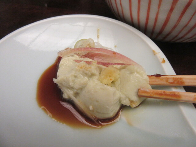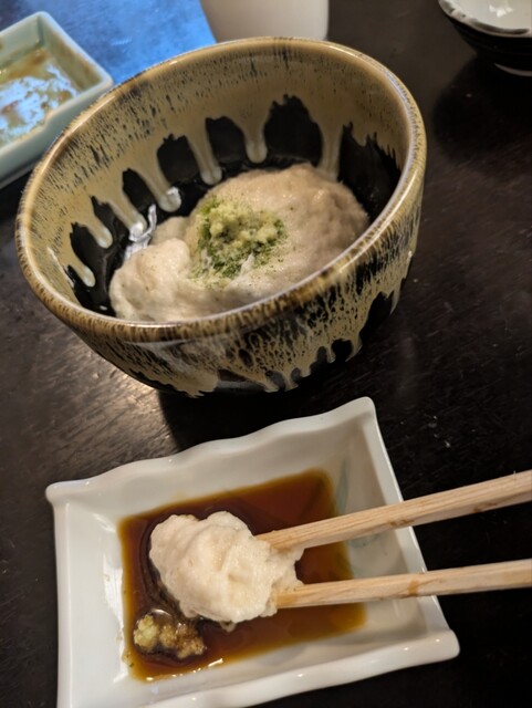 自然薯ほどでは無いが粘りが強いため箸で摘まんで、小皿で添えられた醤油を浸けて口に運ぶ。