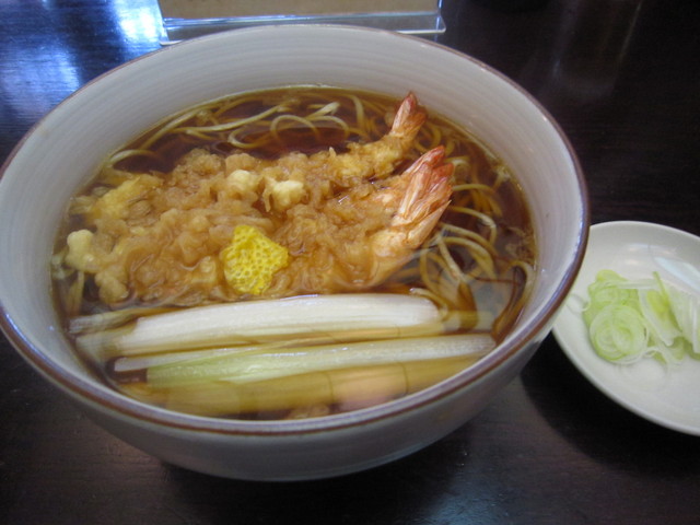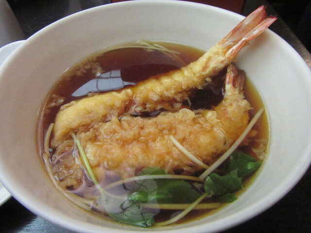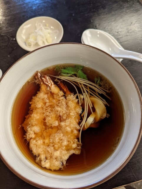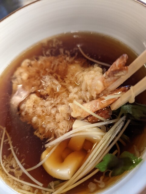 つゆには小海老を3連に筏揚げにした天ぷらと細切りの葱と三つ葉が浮かび、柚子皮が香りを添えている。