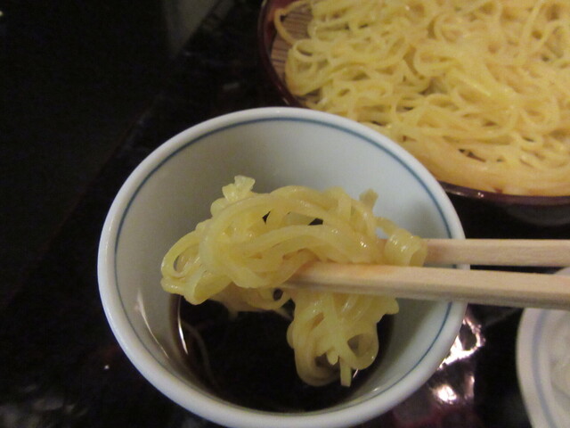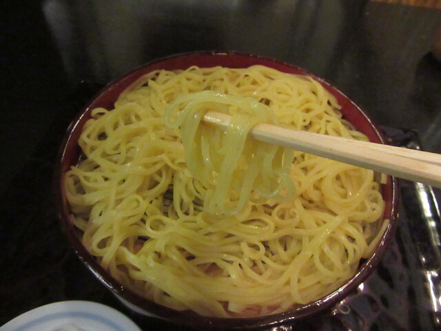 こちらの蕎麦は普段'挽きぐるみ'で打たれるが、「ゆずきり」は色を綺麗に出すため更科粉を特別に仕入れていると思われる。