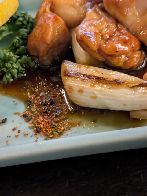 一口サイズにカットされた腿肉数個が、煮詰まったたれに絡められており、下には3㎝程にカットされ焦げ目が付いた白葱が横たわっている。
