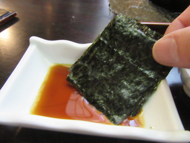 具材の下には海苔が一枚敷かれているが、蕎麦が無いため早めに溶けるため、つゆ自体が海苔汁の状態になるがそれも一興。