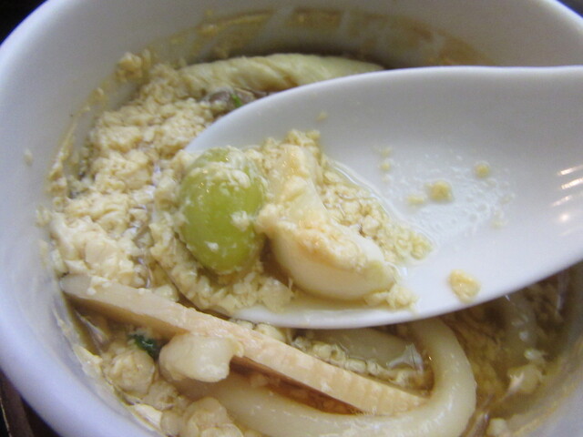 まずは蓮華でつゆをひと掬いすると、元々コクのある味わいに天ぷらの旨味が加わり実に美味い。