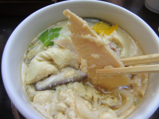 暫しの後に登場した丼上の景色は当然ながら「おかめ」と同様で、定法通りの2枚の蒲鉾の他に自家製玉子焼き・湯葉・鳴門・青味のほうれん草、もちろん必須アイテムの椎茸と筍の旨煮も乗っており、蕎麦が無い分「結び蒲鉾」が一個入っているのも'抜き'ならではの仕事。