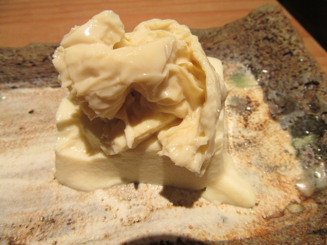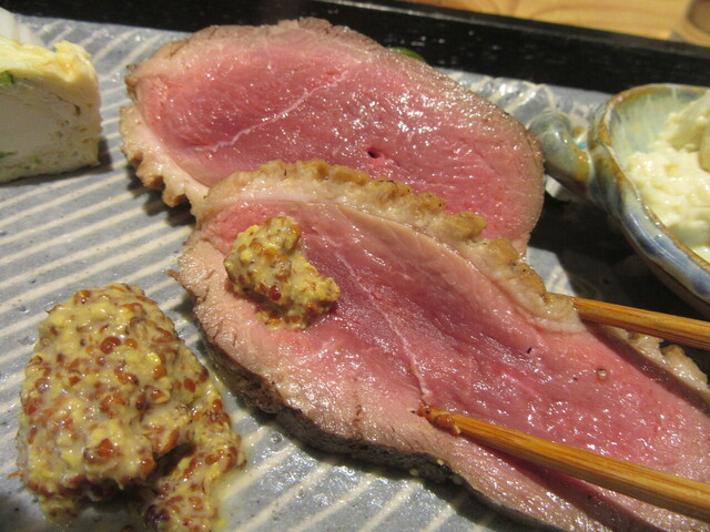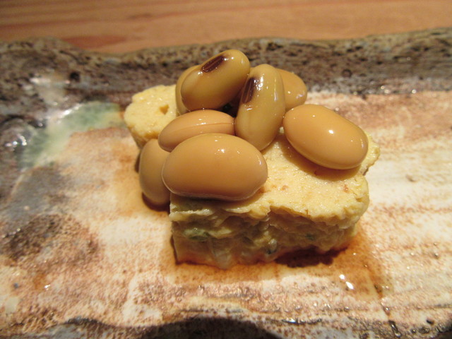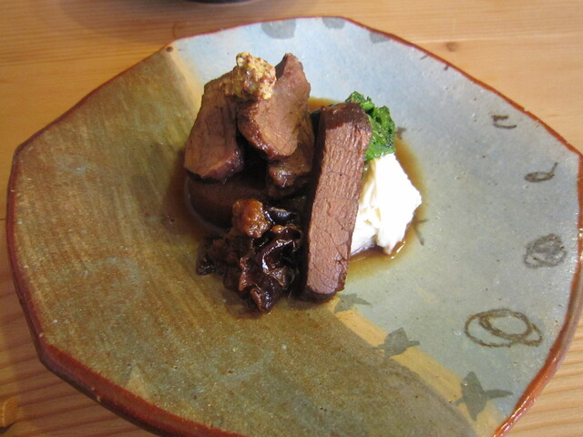 内容は「浸し豆をあしらった玉子焼き・鴨ロース煮・湯葉のせの豆腐」で、いずれも丁寧な仕事で、味もバラエティに富んでいる。