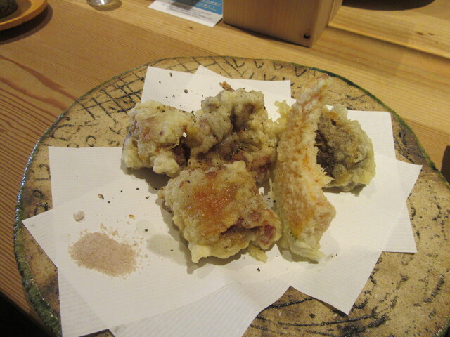 「ほろほろ鳥の天ぷら」:一口よりやや大き目にカットされた身4個が、軽く下味をつけてから天ぷら衣で揚げられており、添えは椎茸と南瓜。