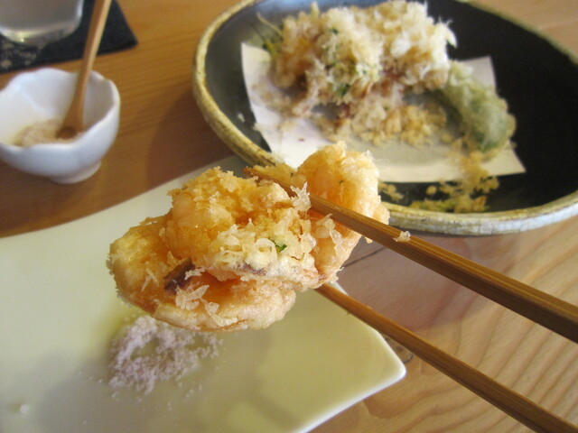さっくりとした揚げ上がりでやや身は硬かったが、細巻きを使う「竹やぶ」系に比べ、芝海老のため強めの揚げでも味は抜けていない。