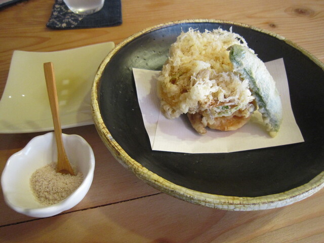 料理には「天然芝海老のかき揚げ」:下半分に芝海老7.8尾が、上に揚げ玉をこんもり乗せた独特の形状で登場。