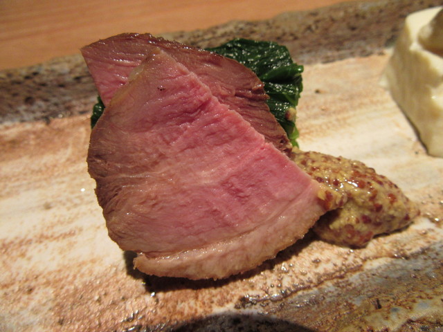 特に印象に残ったのは、分厚くカットされた2切れの鴨ロースで、噛み応え十分で旨味は濃く、添えられたわさび菜のお浸しも美味い。