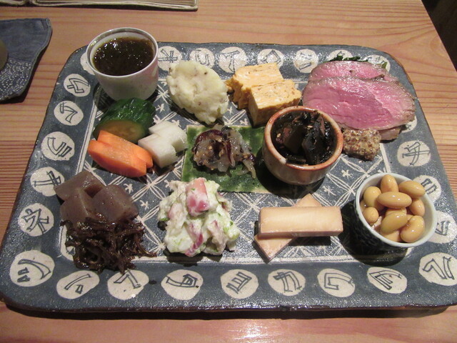 11品が盛り合されており、内容は「鴨ロース炙り・味噌豆・チーズのかえし漬け・北寄貝と烏賊のマヨネーズ和え・蒟蒻と小女子の旨煮・生クラゲの梅しそ和え・昆布と海苔の土佐煮・玉子焼き・ポテトサラダ・もずく酢・ぬか漬け3種」という、バラエティに富んだ品々。