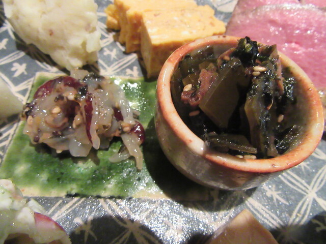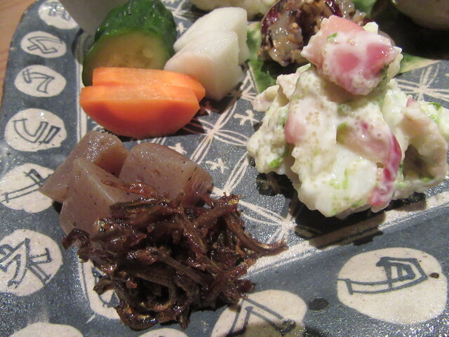 北寄貝や生クラゲのコリコリの食感、ひと手間掛けられたポテサラや、蒟蒻やぬか漬けのしみじみとした味わいも良好。