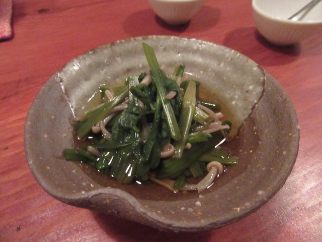 二つ目は「芹とえのきのお浸し」:芹のほのかな苦みと歯触りが心地良く、出汁の含ませ加減も程よい。