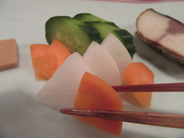 「三種盛り合わせ」:本店でもおなじみのチーズのかえし漬け・自家製糠漬け・鯖の燻製の3種で、いずれも安心できる味わい。