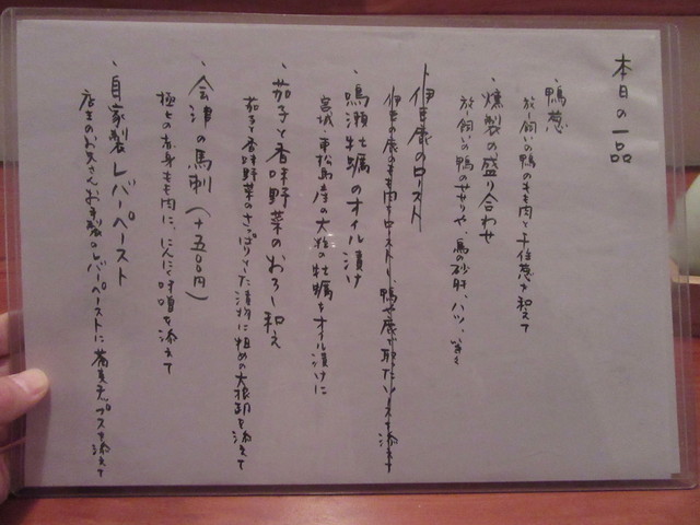 もう一品は「鴨葱」:独特の放し飼い養殖を行っている「西崎ファーム」の合鴨を使用し、そのもも肉のスライスと千住葱を合えてある。