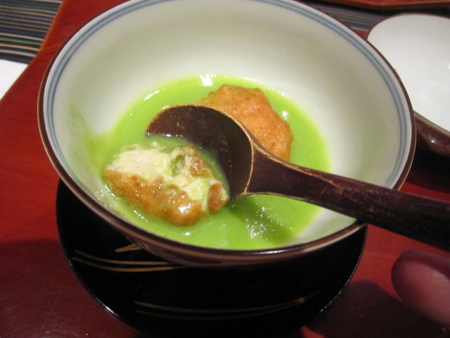*蓋物:「胡麻豆腐のうぐいす仕立て」で、揚げた胡麻豆腐は表面はカリッと中はとろっとしており、これにたっぷりのグリーンピースの裏ごしの取り合わせ。
