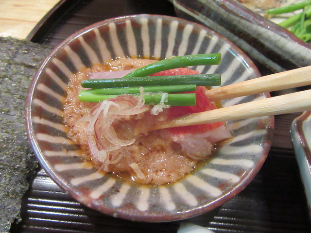 肝醤油は蒸した鮟肝の裏ごしを調味したもので、ご主人は'足りなかったら仰って下さい'と言葉を添えたが、薬味類とともに海苔に挟んだだけでも美味く、追加で頼んでいたら確実にこれを舐めながら酒が一合は空きそう。