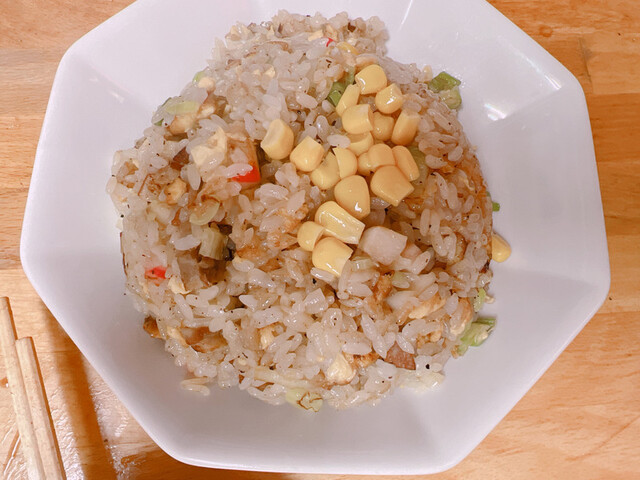 お父さんのチャーハン作りは芸術的です。ちゃんとてっぺんにコーンがきます。