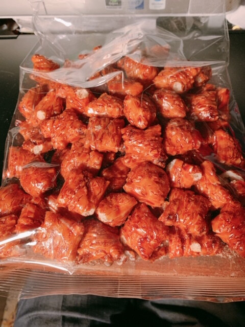 うにおかき100g250円、ケースにはあらかじめ100gに小分けされたうにおかきがあります。