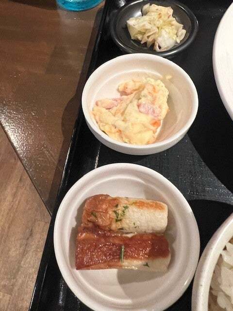 単品のポテトサラダとポクテキの付け合わせのポテトと味が違いますね。